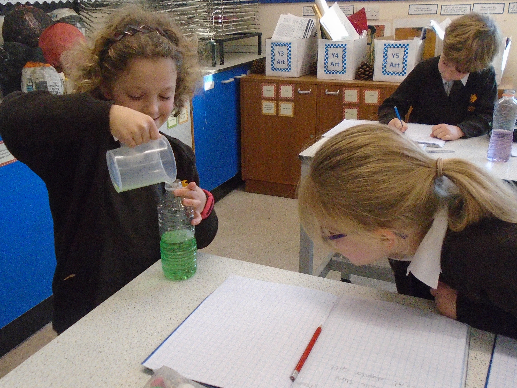 This week, Year 3 have been working on the topic of volume. We have had a fun week, measuring out amounts of coloured liquids to investigate whether the colour will change with the more liquid that we add. We concluded that the colour goes a bit lighter after adding 100mls of water. Year 3 also linked their volume work to English by creating a potion in Mrs Creedon’s Potion Lab for our evil character Starjik who froze children in a tomb of ice. Some children made a potion to help Ivan (our hero) and save the children, other members of the class made a potion to support Starjik and freeze the young children. To create their potions, the children measured out different liquid from Mrs Creedon’s Potions, added them together in their own potion bottles, wrote instructions for their potions and then added up all the volumes of liquids at the end. What a fun week. Well done Year 3! See the Year 3 Gallery for more photos.