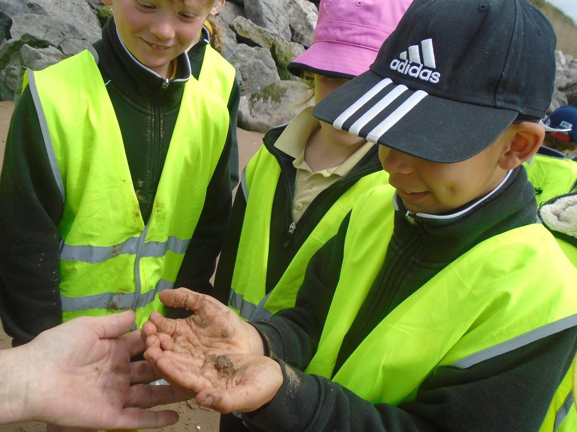 When arriving at the beach, we firstly collected different objects we could find around such as seaweed, stones, shells and even a mermaid’s purse (fish egg sack). We used these objects to create a visual including the moon phases, the sun and the Earth to learn about what controls the tide. We also spotted a crab on the beach which some of year 3 were really brave and were able to hold safely.