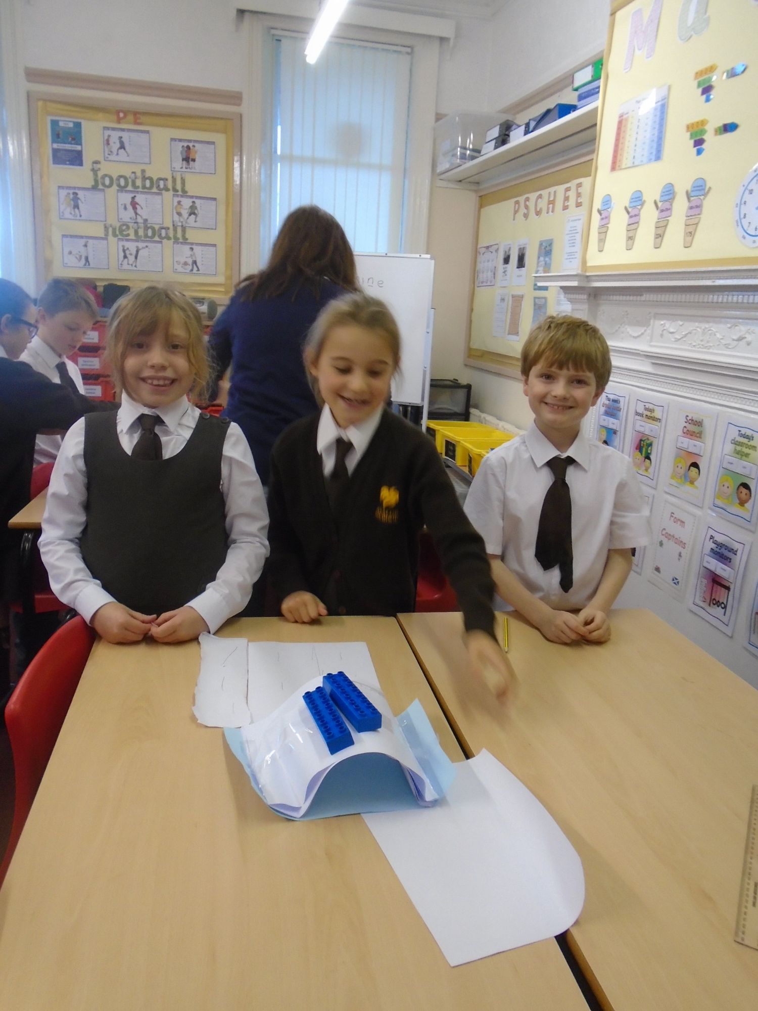 In Maths we have been measuring and timing activities to do with construction. The children then had to work in a small group to create a bridge out of paper and sticky tape that could hold the weight of two lego bricks.